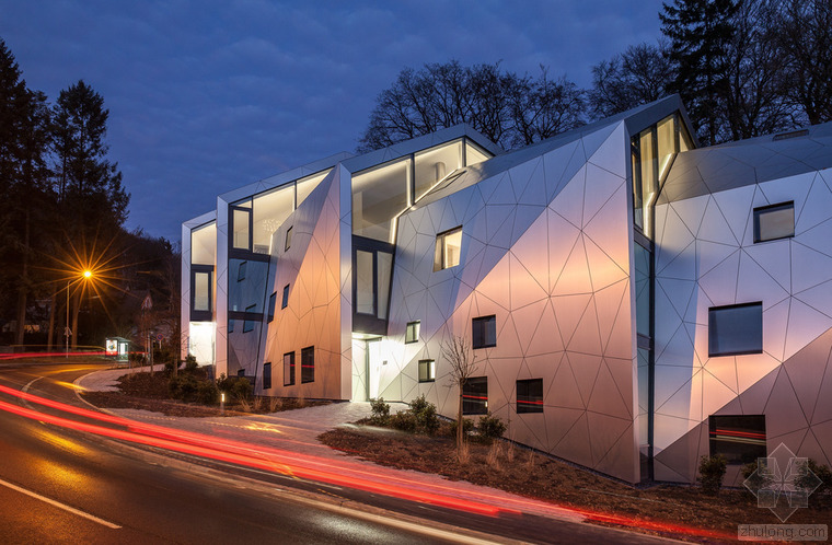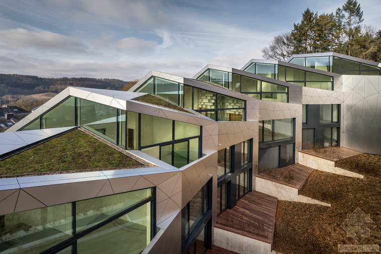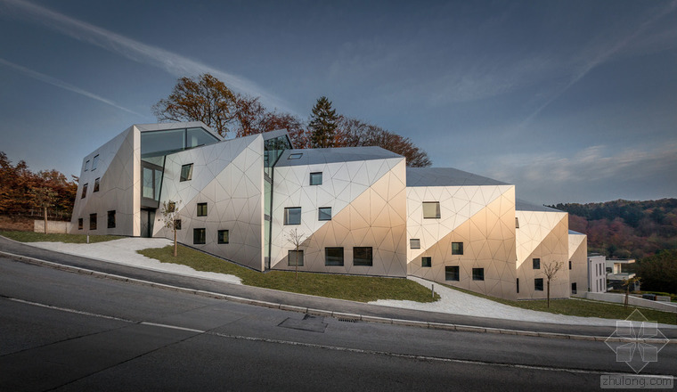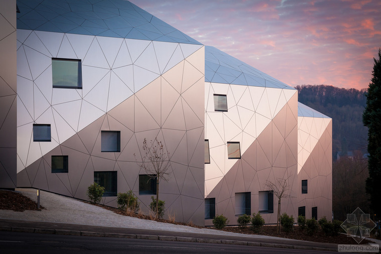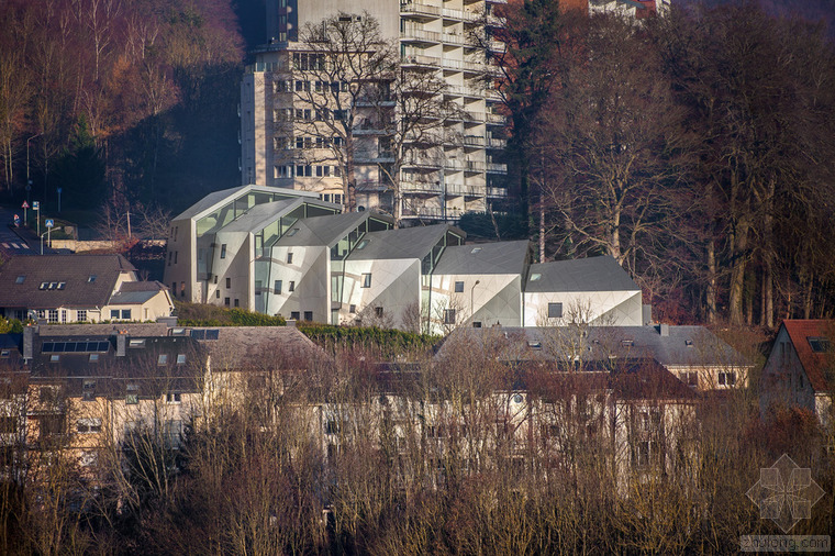 根據(jù)城市建筑規(guī)章條例規(guī)范,無論地形有多奇怪,都可以建造簡易的兩層單體建筑,并且?guī)в械叵率?。但是,周圍的環(huán)境、特殊的地形條件和基地的形式造就了各種各樣的建筑,與此同時也產(chǎn)生了上文所指出的問題?;匚挥谝粭l十分彎曲的街道邊緣;地形高差達10米,非常陡峭;基地上保留有樹齡300年的古樹,且被列為國家歷史文物。所有的這些狀況使建筑有了最初的形狀。此外,該建筑還呼應了特殊的城市環(huán)境(一邊是小體量的住宅單元,而另一邊是大體量的公寓樓。)建筑師通過將主體分成六個小的、垂直位移的體塊,創(chuàng)造了一個巧妙地轉(zhuǎn)變。建筑通過這種方法適應了環(huán)境,既保持了所需的密度,又賦予其歸屬感、特性和人性化。體塊的分割和位移需要謹慎地研究自然采光的需求、朝向城市景觀的開闊視野,并且創(chuàng)造天地之間的視覺連接,同時還要保護住戶的隱私。