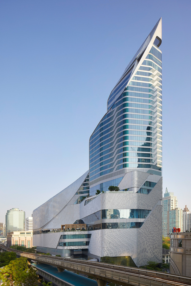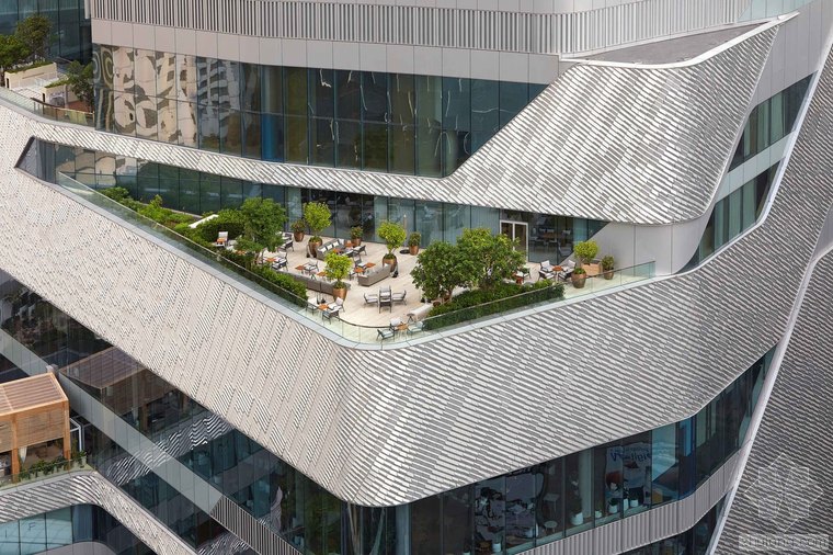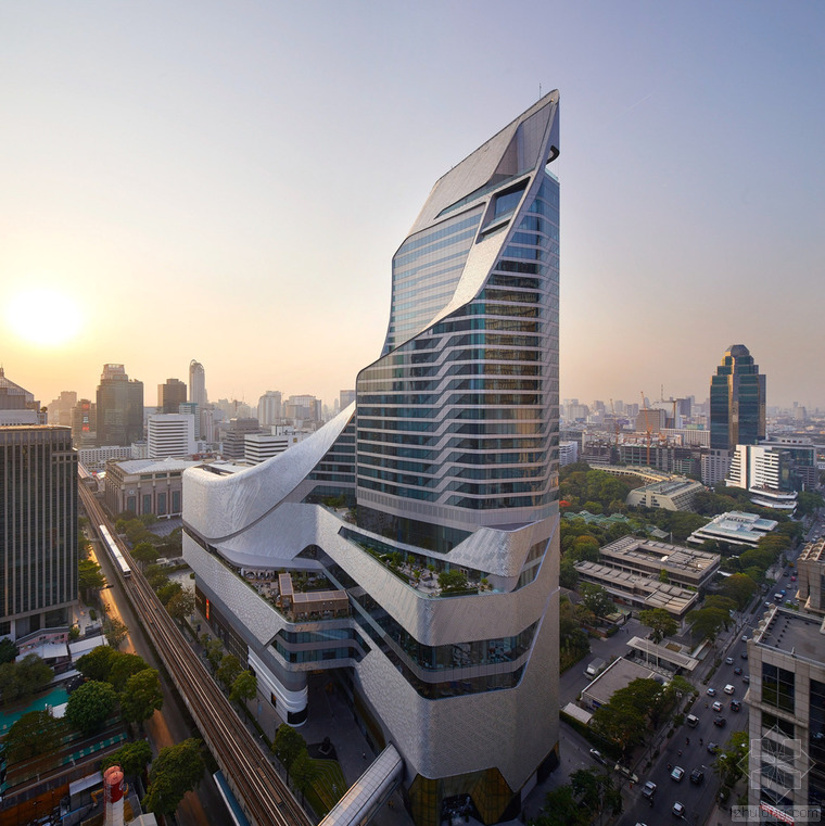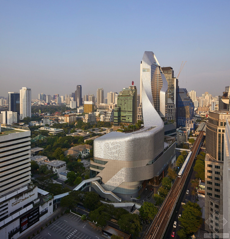 曼谷中心大使館為曼谷這座城市帶來了全新的印象,無論是從街道還是從天際線來看,它都展示出一種邀請(qǐng)的姿態(tài),歡迎曼谷人和全世界人來參觀。項(xiàng)目位于之前英國(guó)大使館的花園中,沿著曼谷最重要的商業(yè)干道 Ploenchit 大路,占地150萬平方英尺(約139萬平方米)的綜合體包括一個(gè)7層的奢侈品零售區(qū)和27層的五星級(jí) Hyatt 酒店塔樓。這座塔是第一個(gè)英國(guó)建筑師在泰國(guó)完成的項(xiàng)目。酒店和購物中心使用連續(xù)循環(huán)的形式,使裙房和塔樓更直接的結(jié)合在一起。塔樓連續(xù)的線條似乎打破了裙房的大體量,在尺度上創(chuàng)造了一種非對(duì)稱的結(jié)構(gòu)。這種形式的開放,包容了城市并且建立了一種相互的視野,一系列的室外平臺(tái)和露臺(tái)可以看到彼此。兩個(gè)垂直的光井,完全的打開塔樓內(nèi)部空間,可以看到層層疊疊不斷向上變化的平臺(tái),同時(shí)這些平臺(tái)又劃分了酒店的功能:面對(duì) Nai Lert 公園的私人會(huì)客空間、酒吧、接待休息室和面向市中心的天臺(tái)。
