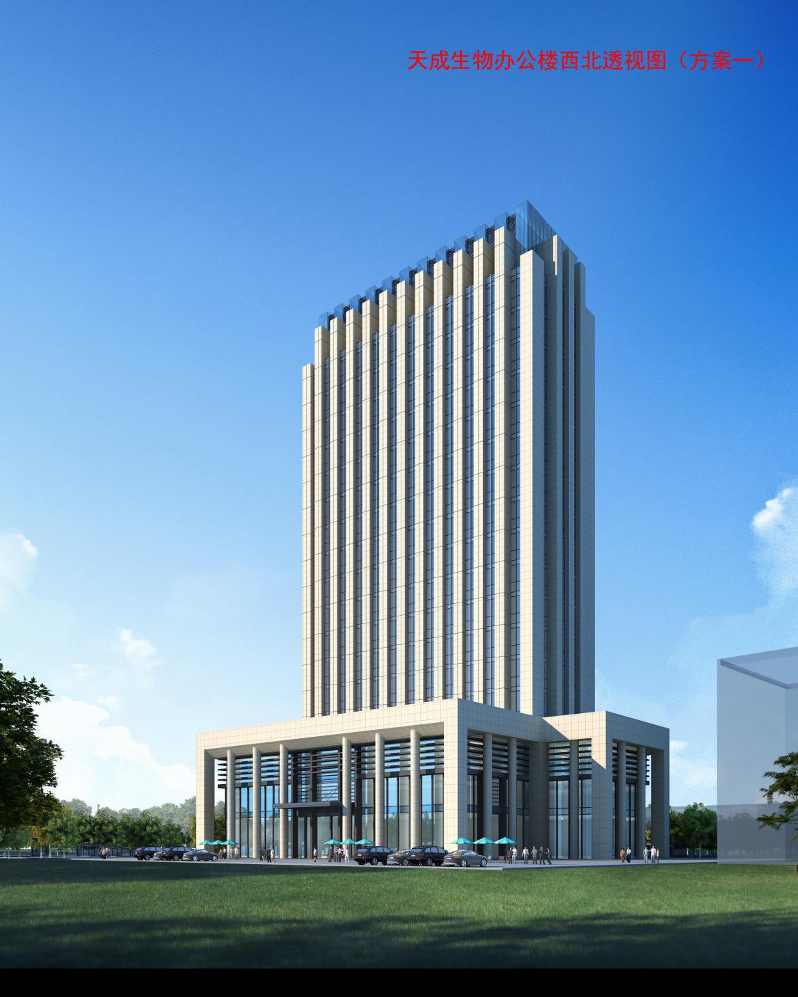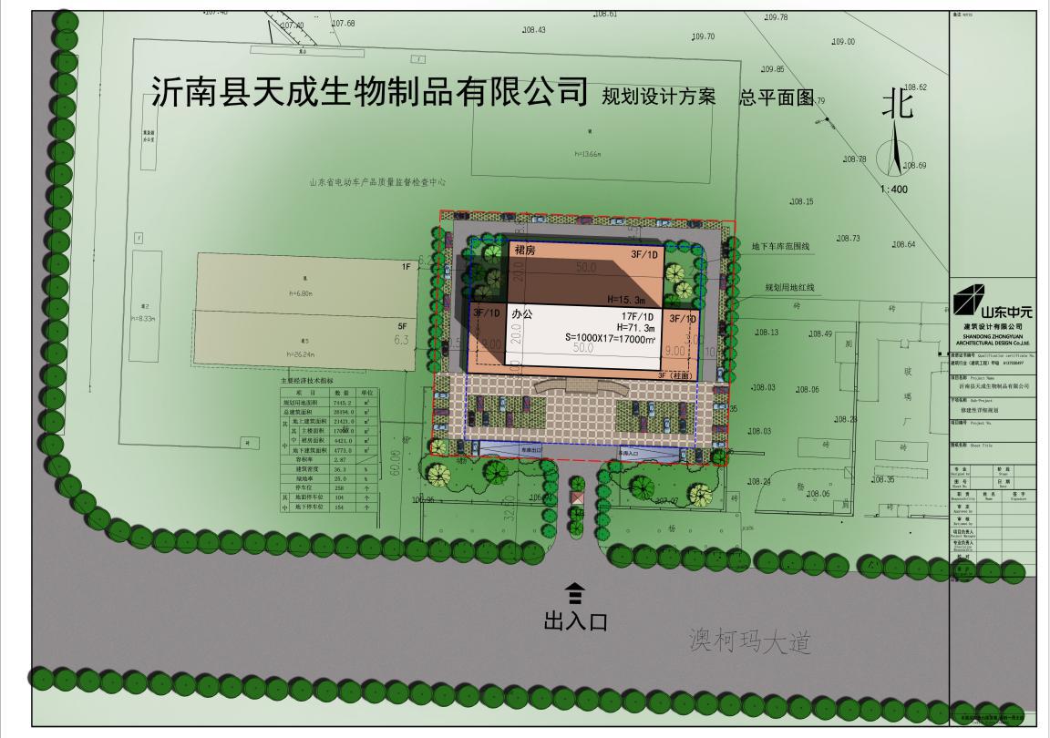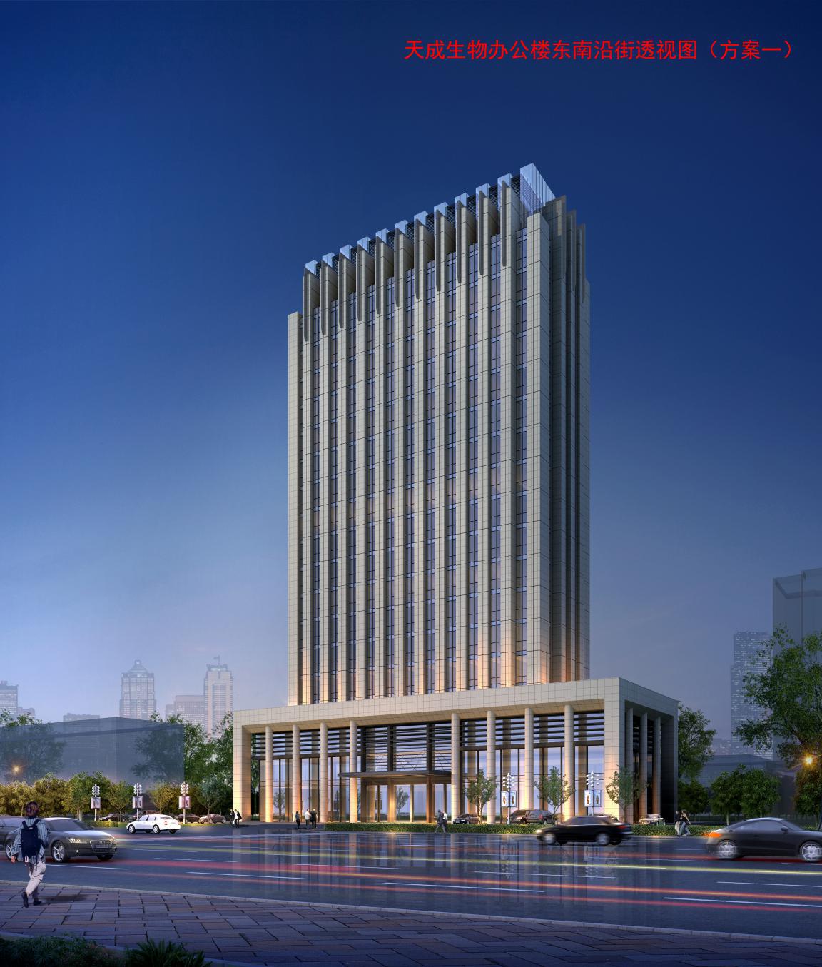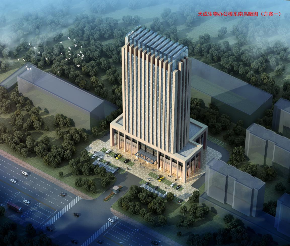 天成生物有限公司辦公樓位于沂南縣澳柯瑪大道,規(guī)劃面積有7445.2㎡,建筑面積26194.0㎡,地上17層地下1層,停車位規(guī)劃二百五十多個,極大的滿足了辦公停車需求。甲方要求辦公樓簡潔實用,美觀大方。所以規(guī)劃設(shè)計時,規(guī)劃設(shè)計師充分考慮到實用與建筑美觀相結(jié)合,設(shè)計中使用簡約風格。簡約風格的特色是將設(shè)計的元素、色彩、照明、原材料簡化到最少的程度,但對色彩、材料的質(zhì)感要求很高。因此,簡約的空間設(shè)計通常非常含蓄,往往能達到以簡勝繁的效果。在主樓低層東、西、北三面向外延伸加建裙房,三個裙房成品字型環(huán)繞主樓把主樓圍在中間,并在裙房最外部延邊設(shè)置圓柱,使整個底部既美觀又堅固。裙房使用玻璃擋墻,透光性好。主樓設(shè)計中添加了線條美,以線成面,突顯出建筑的“肌肉”,線條從底部一直到頂部,筆直的聳立在那里。辦公樓的頂部形成交錯相隔,玻璃建筑與水泥建筑相融合,使得辦公樓頂部完美收關(guān)。
