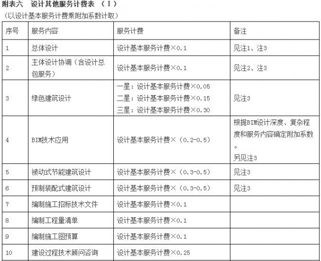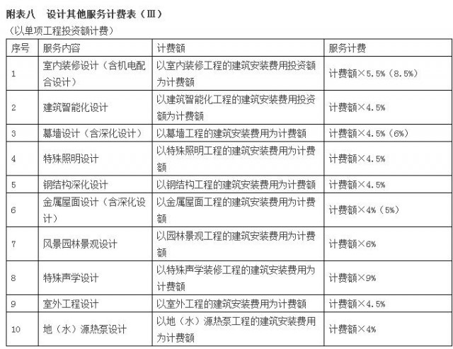 設(shè)計其他服務(wù)包括的內(nèi)容見第一章2.3條款所述,其計費詳見附表六《設(shè)計其他服務(wù)計費表(Ⅰ)》、附表七《設(shè)計其他服務(wù)計費表(Ⅱ)》及附表八《設(shè)計其他服務(wù)計費表(Ⅲ)》。第一章2.3條款未涉及的設(shè)計其他服務(wù)內(nèi)容的計費可比照附表六、七、八執(zhí)行。