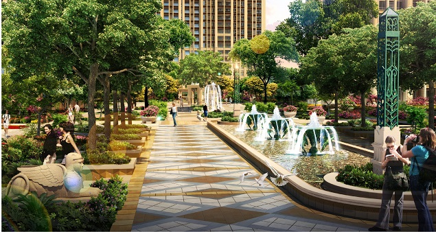 整個建筑規(guī)劃呈現(xiàn)沿中軸對稱布置的規(guī)劃手法,意在打造強(qiáng)烈的禮儀感規(guī)劃布局,營造舒適的空間氛圍。結(jié)合規(guī)劃布局特點(diǎn),打造對稱規(guī)則的中央景觀,切合禮儀感的規(guī)劃特點(diǎn)。