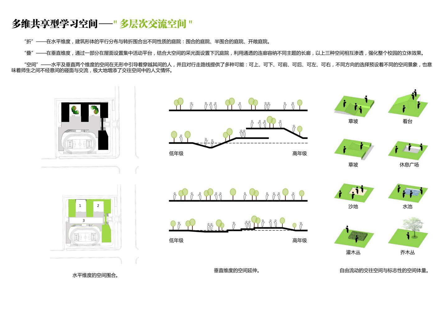 “雙地下”概念是將操場(chǎng)以下的土地進(jìn)行有效利用,將2F綜合樓地下以及操場(chǎng)地下一層作為食堂使用,內(nèi)部包含廚房以及教職工食堂,建筑面積為5460平方,可容納3000人。將食堂的北側(cè)以及西側(cè)設(shè)置6M以上寬的下沉庭院,解決食堂的采光通風(fēng)問(wèn)題,也結(jié)合樓梯踏步與景觀設(shè)計(jì)增加學(xué)生的趣味性。第二個(gè)地下就是學(xué)校西側(cè)地下一層作為教師的內(nèi)部停車庫(kù),可停放200輛車輛,面積為7500平,操場(chǎng)的地下二層設(shè)置地下接送系統(tǒng),作為家長(zhǎng)接送孩子的專用停車庫(kù),可停放160輛車輛,面積為5200平方,內(nèi)部設(shè)置閘機(jī),家長(zhǎng)等候區(qū),閱讀區(qū),學(xué)生刷卡出校后家長(zhǎng)手機(jī)會(huì)接收到短信,便捷的接送到孩子。緩解了學(xué)生上下學(xué)學(xué)校附近的交通壓力。